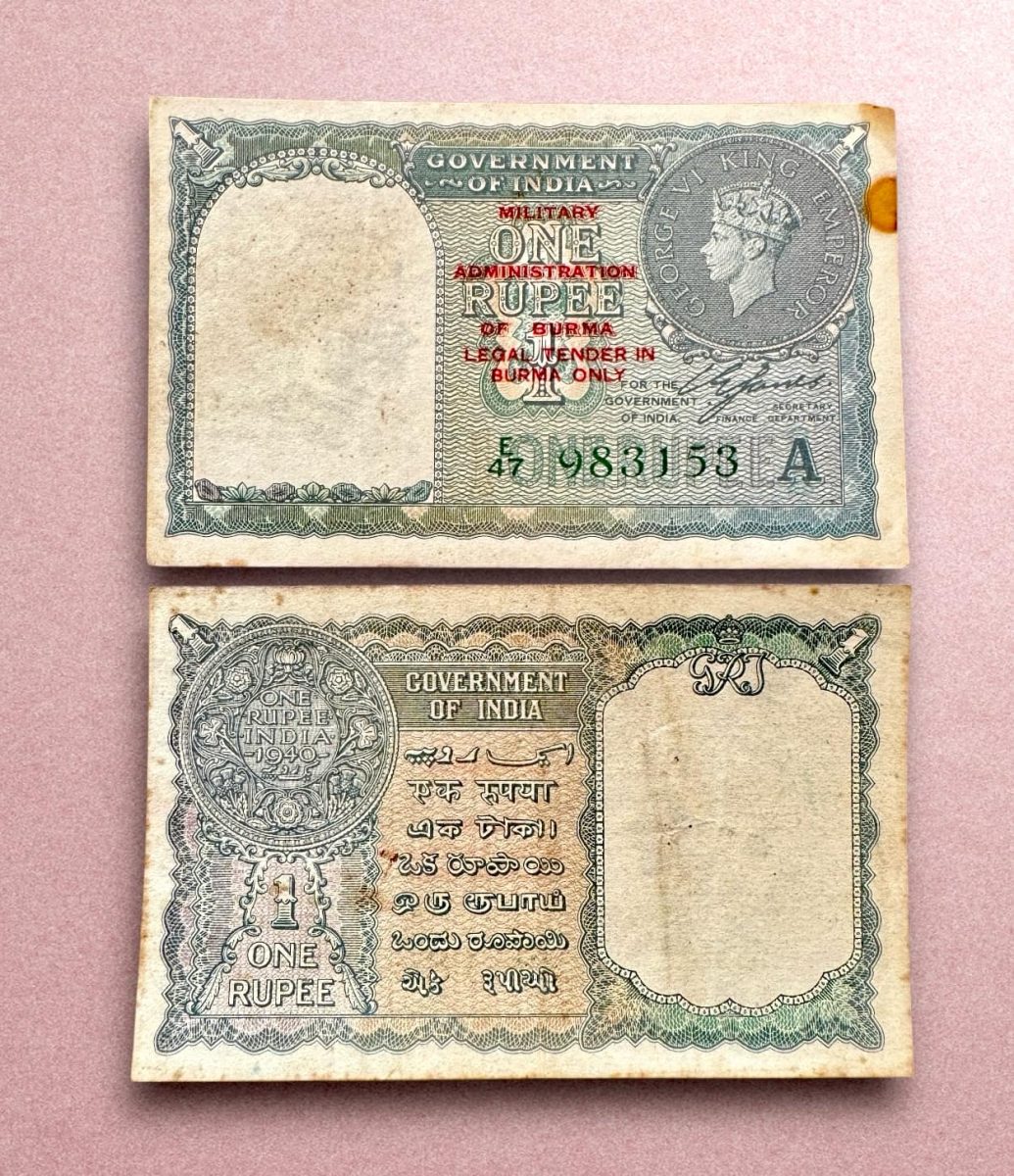 Re 1 British India Banknote 1940 Series Black Series King George VI Collectible Quality 983153 Burma Issue Unique and Rare Issue