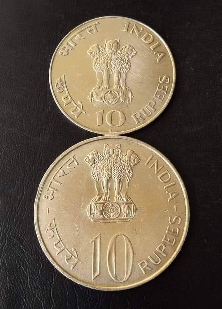 – Two commemorative ₹10 silver coins from India, dated 1969 and 1972