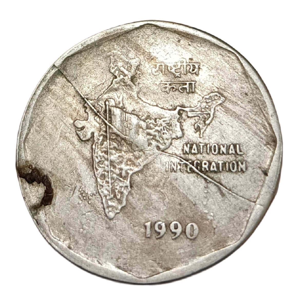 2 Rupees Cu/Ni Big DABBU Issue Year 1990 Calcutta Mint DIE CRACK Error in Collectable Grade.