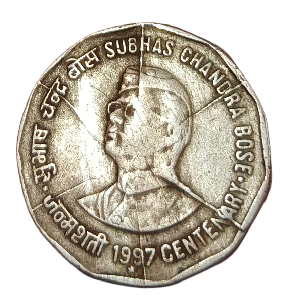 2 Rupees Cu/Ni COMMEMORATIVE Issue NETAJI Year 1997 HYDERABAD Mint MULTIPLE DIE CRACKS & EXTRA METAL Error in Collectable Grade.