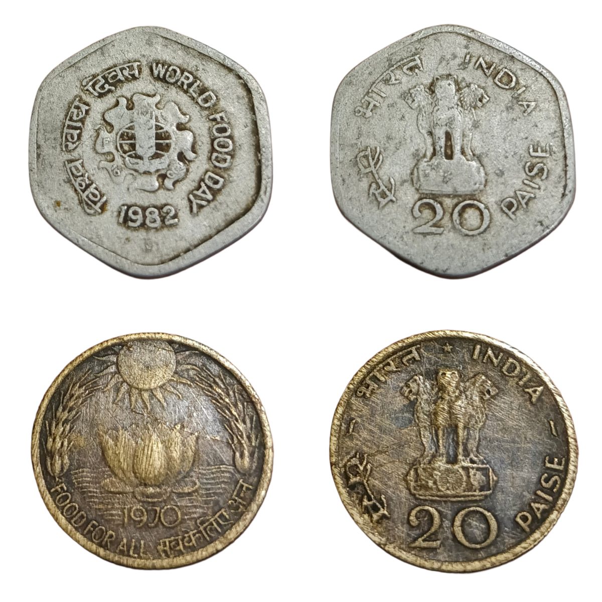 20 Paisa Ni/Brs & Aluminum COMMEMORATIVE “FAO” Series FOOD FOR ALL & WORLD FOOD DAY Set 2 Coins Used Conditions.