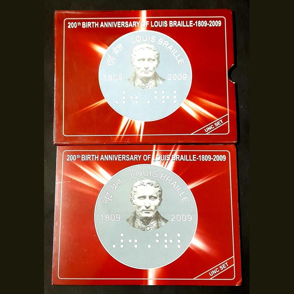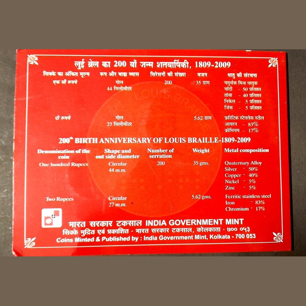 200 th Birth Aniversary of Louis Braille Unc Set 100 Rs 2 Rs Kolkata Mint