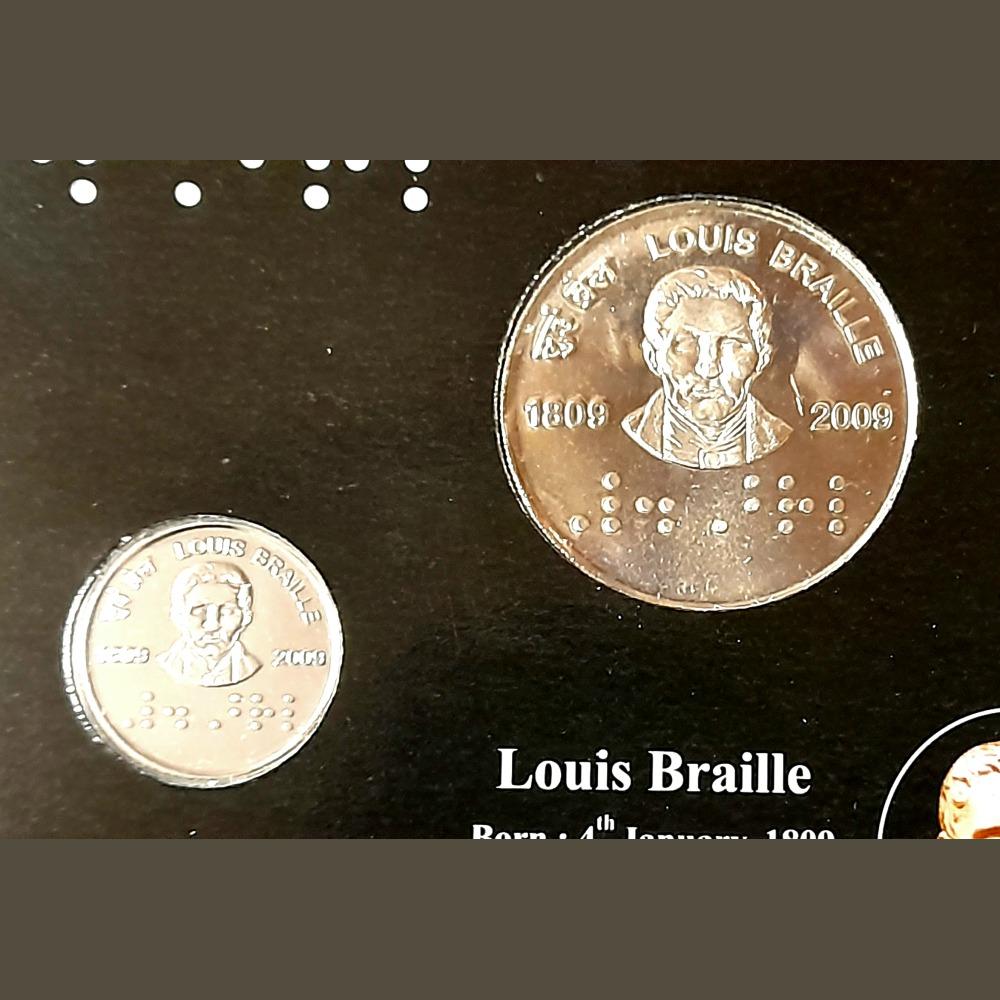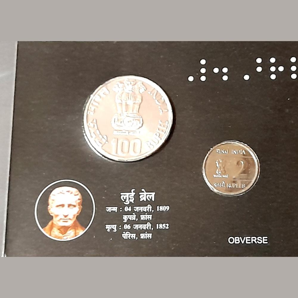 - 200 th Birth Aniversary of Louis Braille Unc Set 100 Rs 2 Rs Kolkata Mint