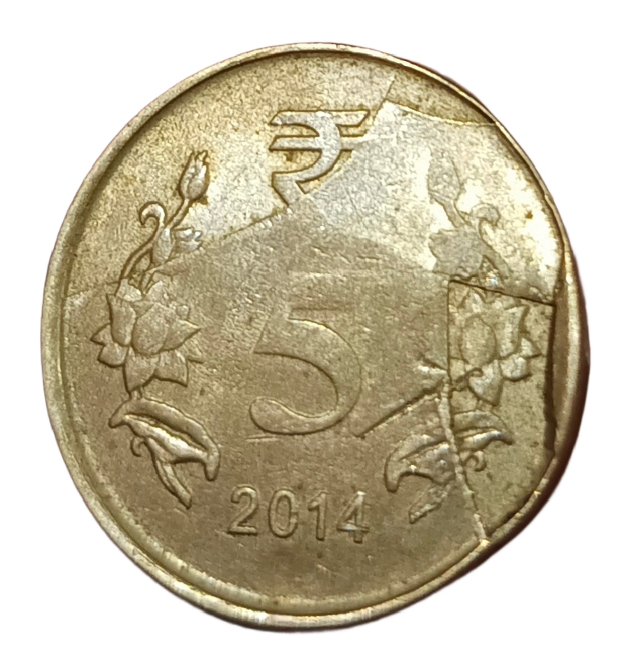 5 Rupees Ni/Brs Year 2014 DIE CUD EXTRA METAL, RETAINED BROKEN DIE & CLOCK ROTATION Multiple Errors **RARE** High Collectable Grade.