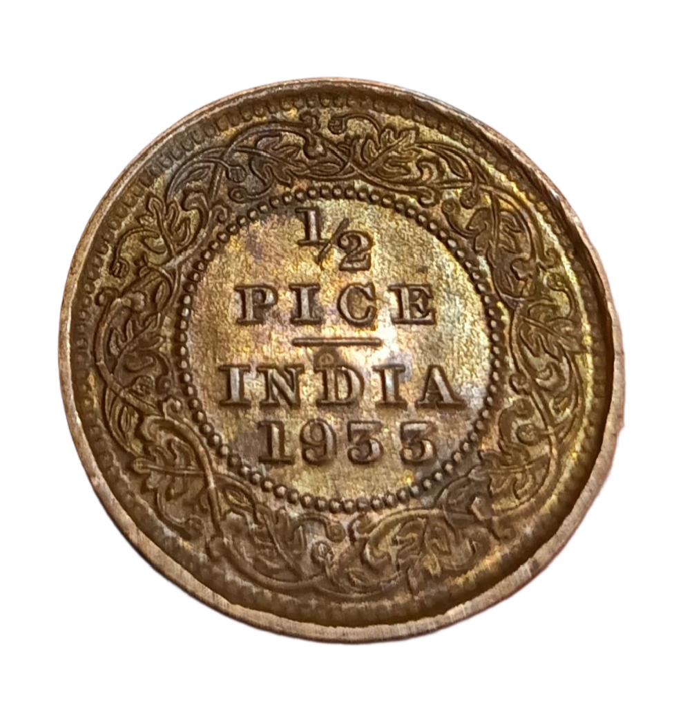 Step back in time with this exquisite British India Copper 1/2 PICE coin from 1933, featuring the portrait of King George-V. Issued by the British colonial authority, this coin is a rare gem in UNC (New) condition, bordering on Almost UNC (Almost New), making it a prized addition to any numismatic collection.