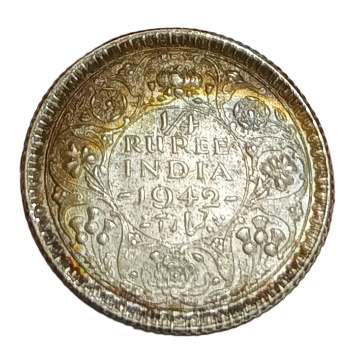 British India Silver 1/4 Rupee Year 1942 King GEORGE-VI with Rainbow Tonning UNC Grade.