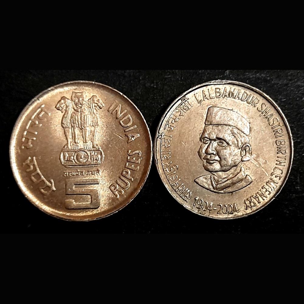 Five Rs Lal Bhadur Shastri ji 1904-2004 Calcutta Mint Single Mint Copper Nickel Coin 5 Pcs Given 01