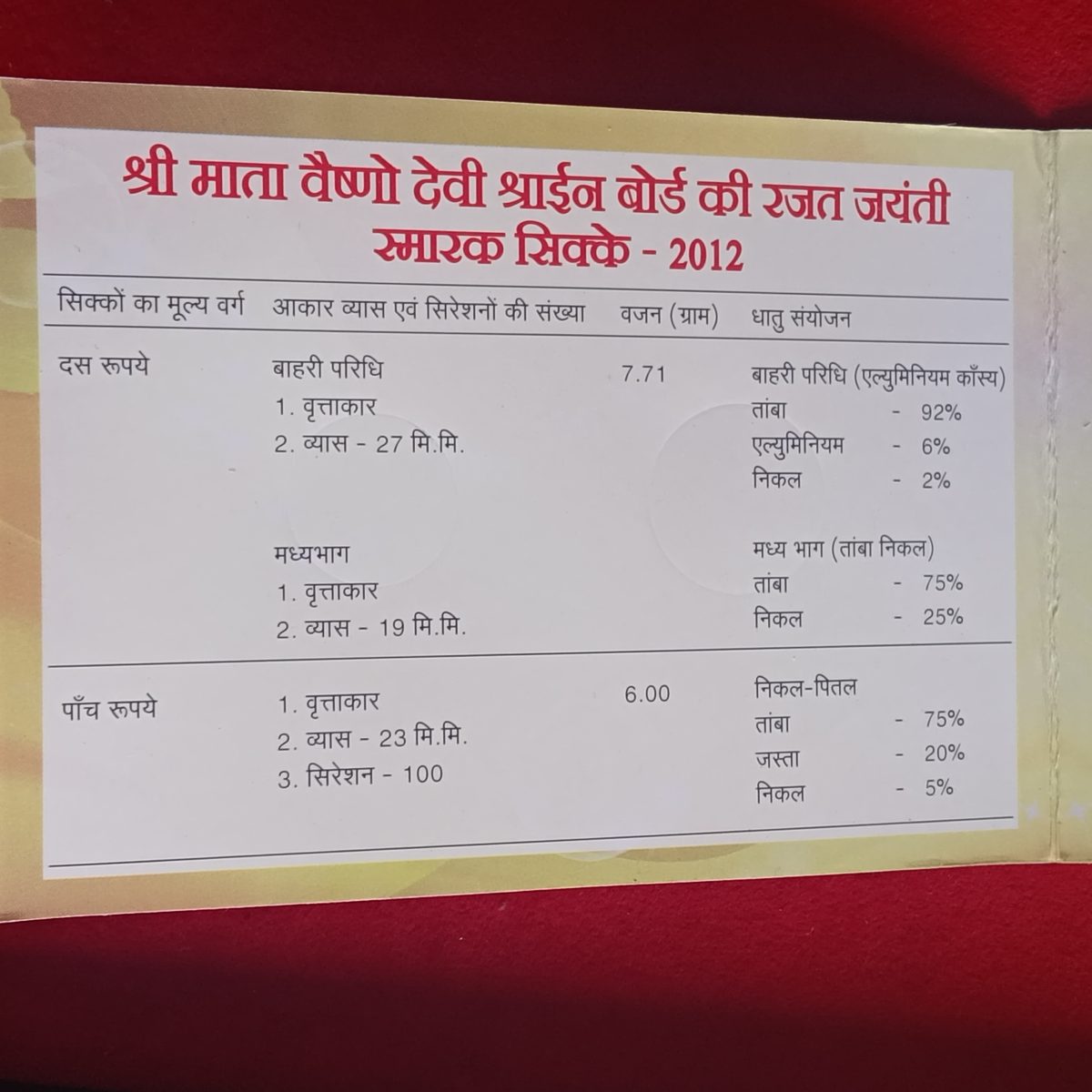 Immerse yourself in the rich history and cultural significance of the Five Rs or Ten Rs Rare Shri Mata Vaishno Devi Shrine Board Silver Jubilee Set from the year 2012, issued by the Bombay Mint in Mumbai. This exquisite collectible set commemorates a special milestone for the Shrine Board, featuring both 5 Rupees and 10 Rupees denominations in stunning UNC (NEW) condition.