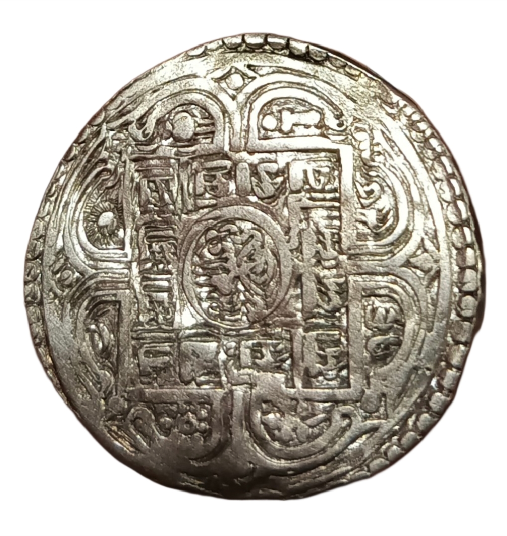 This NEPAL Silver ONE MOHUR coin features a striking error with prominent DOUBLE STRIKES, making it an exceedingly rare and high-grade collectible. Issued under the rule of Ruler Prithivi Vir Vikram Shah, this coin showcases remarkable craftsmanship and historical significance. Crafted from exquisite silver, this coin stands out for its unique error and impeccable condition. Dating back to a significant era, this coin holds immense historical value, commemorating the reign of Ruler Prithivi Vir Vikram Shah.