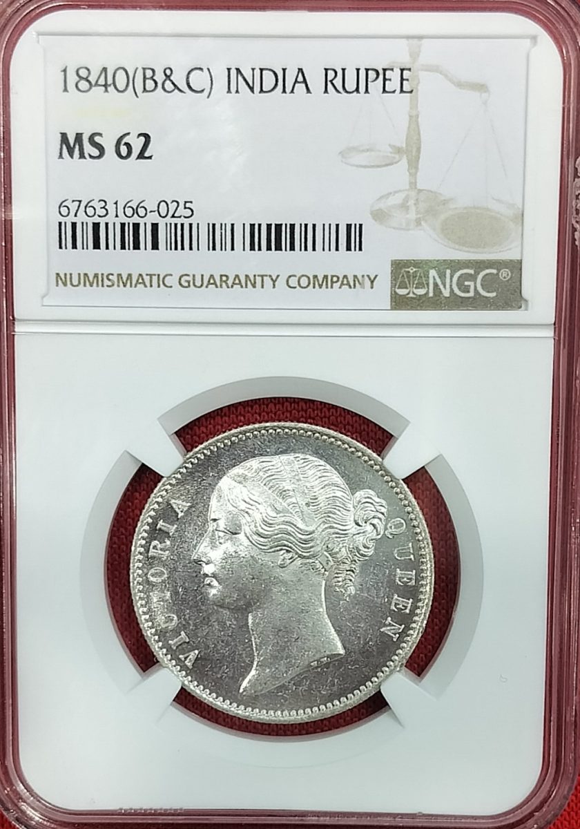 Immerse yourself in the rich history with this exquisite One Rupee coin from 1840, graded MS 62 by NGC. This collectible piece holds the denomination of 1 Rupee and bears the authority of the British East India Company. Crafted from high-quality metal, this coin showcases remarkable detail and craftsmanship, making it a prized possession for numismatists and history enthusiasts alike.