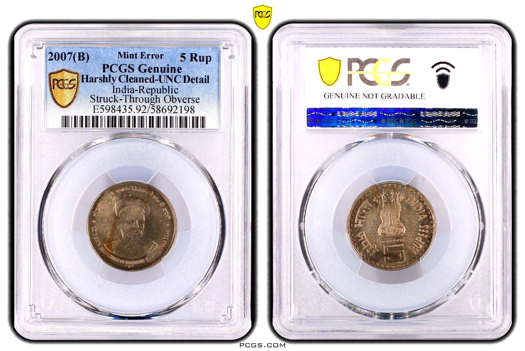 PCGS # E598435 Date, mintmark 2007(B) Denomination 5 Rup Variety Bal Gangadhar Tilak CuNi Mint Error Struck-Through Obverse Region India-Republic Grade Genuine – UNC Details (92 – Cleaned) Security Protected by NFC anti-counterfeiting technology Holder Type PCGS Gold Shield
