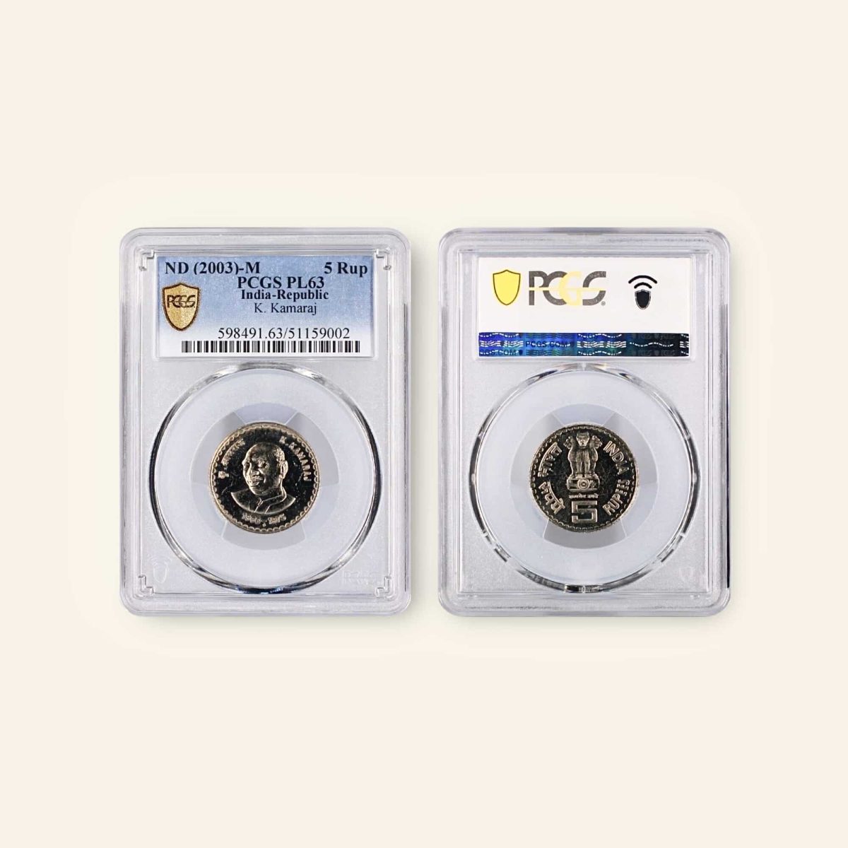 Immerse yourself in the rich history of numismatics with this exceptional collectible – a Rs 5 Copper-Nickel coin featuring the iconic K. Kamaraj, graded PL63 Proof Like UNC. Minted in 2003 by India-Republic, this coin showcases impeccable detailing and a stunning design. The coin’s rarity is underscored by its unique NFC anti-counterfeiting technology, ensuring its authenticity. With a population of only 1, this piece is a true gem for any collector. The PCGS Gold Shield holder adds an extra layer of prestige to this already remarkable item. Perfect for enthusiasts seeking a valuable addition to their collection, this coin represents a piece of Indian history worth treasuring.