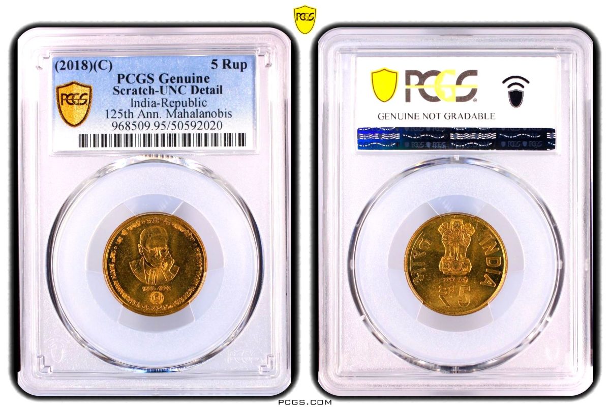 Immerse yourself in the rich history of numismatics with the Rs 5 PCM Kolkata Mint Graded UNC Unique and Rare Commemorative Issue. Minted in 2018 at the iconic Calcutta Mint (Kolkata), this 5 Rupees coin commemorates the 125th Anniversary of Mahalanobis, a significant figure in Indian history. Crafted in nickel, it bears the distinctive (C) mintmark, symbolizing its origin. Graded as Genuine – UNC Details (95 – Scratch) by PCGS, this coin is a testament to its pristine condition. Protected by NFC anti-counterfeiting technology and encased in a PCGS Gold Shield holder, its authenticity is unquestionable. The coin’s scarcity, coupled with its historical significance, makes it a prized addition to any collector’s trove. Dive into the world of rare numismatic treasures and own a piece of India’s heritage with this exceptional collectible.