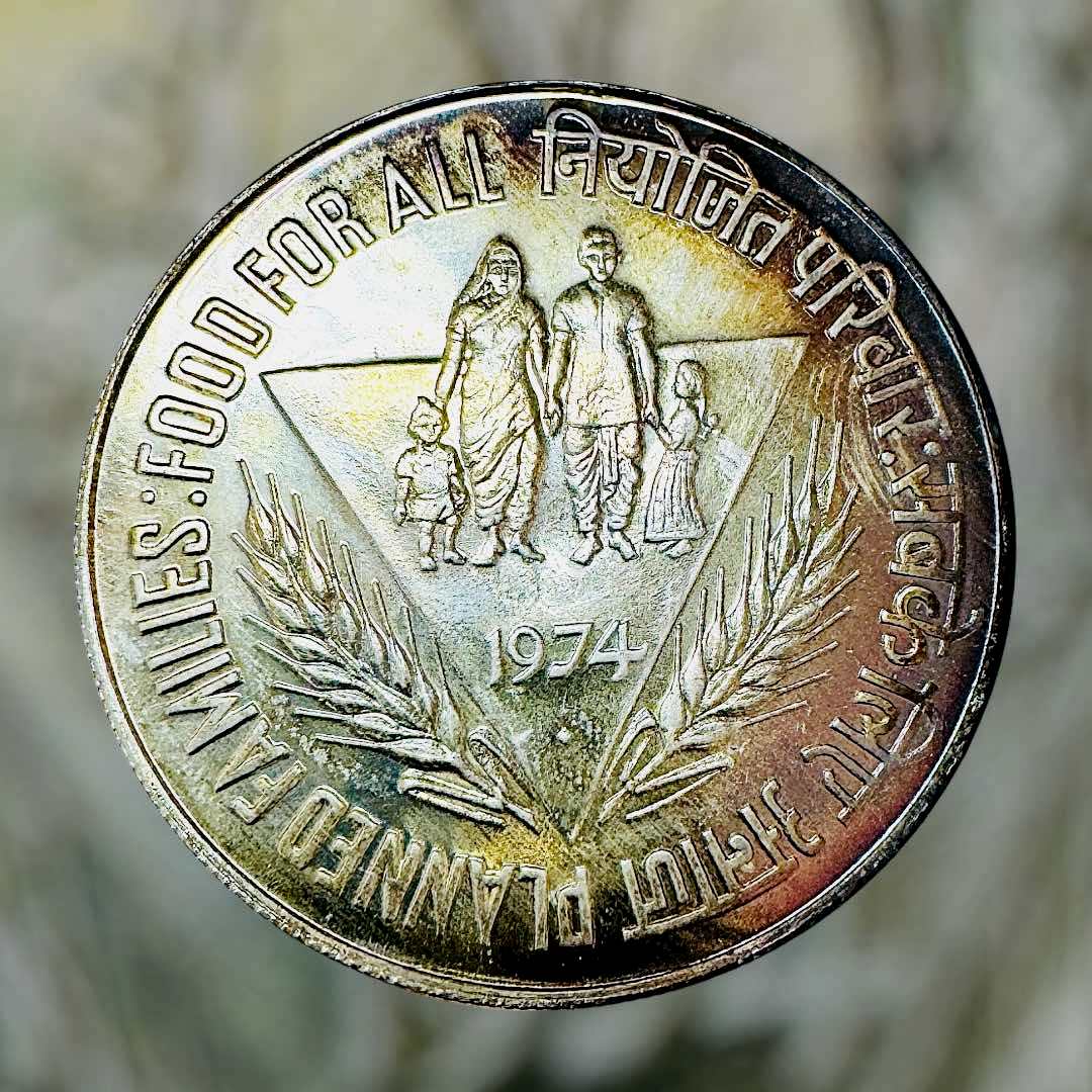Rs 50/- India Government Mint Bombay 1974 Coin Issue Planned Families Food for All 44MM Diameter 50 Percent Silver