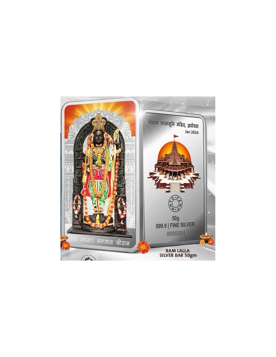 Immerse yourself in the divine aura of the Shree Ram Lala Mandir 50GM 999 Silver Colour collectible bar, a rare and unique piece that encapsulates the essence of Lord Ram’s sacred presence. Crafted by MMTC-PAMP with 99.99% purity, this silver bar pays homage to the Pran Pratishtha ceremony at Ram Mandir, where the divine spirit was invoked into the idol of Lord Ram. The full-scale image of Ram Lalla showcases the 10 avatars of Lord Vishnu, Hanuman, and Garuda, while the reverse side features a colorful depiction of the Ram Mandir in Ayodhya. This exquisite piece serves as a tangible symbol of faith and devotion, offering collectors a precious memento to cherish for generations to come. With its rich historical significance and impeccable craftsmanship, this silver bar stands as a timeless tribute to the enduring power of faith and spirituality.