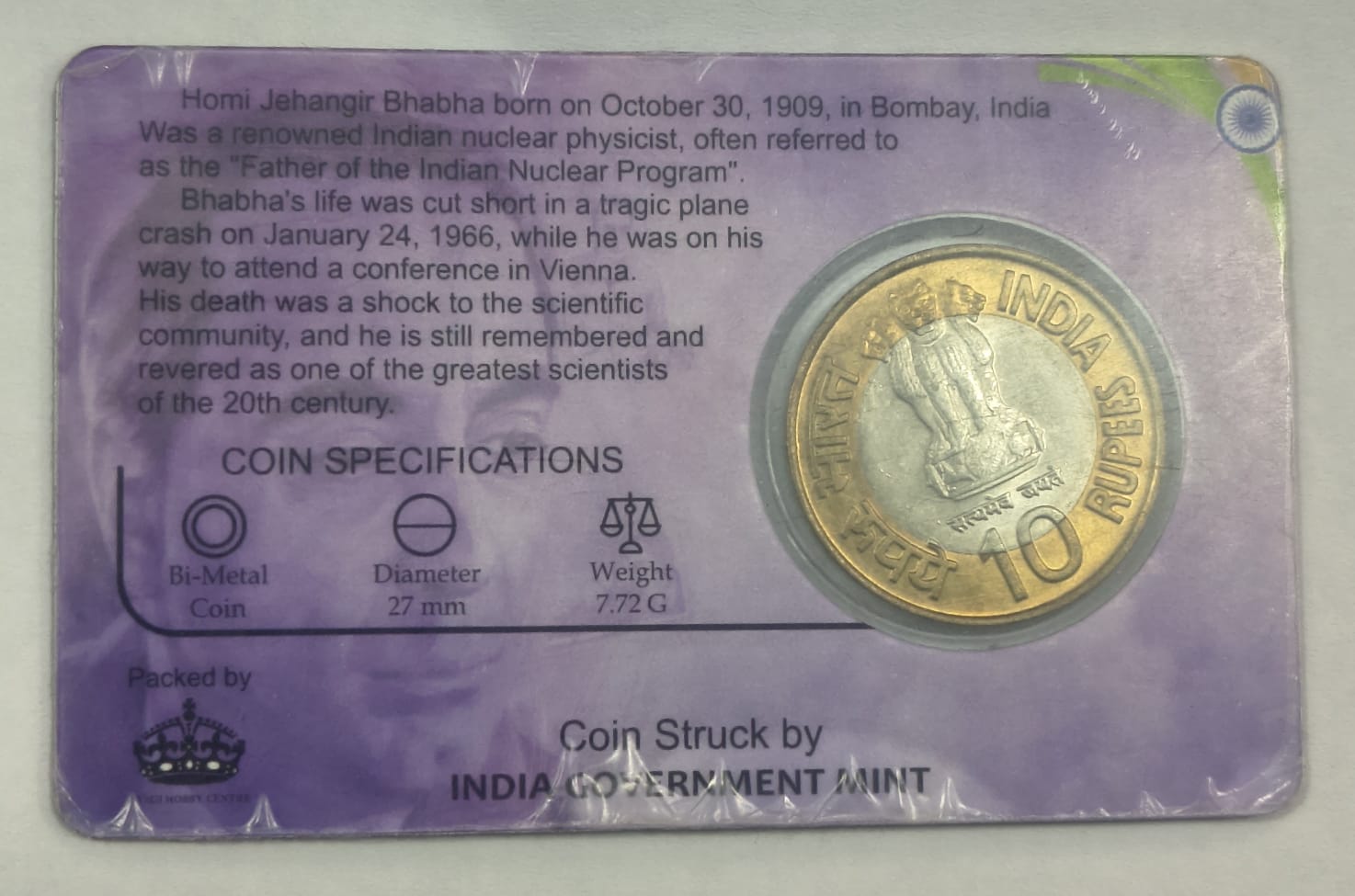 10 Rs (HOMI BHABHA BIRTH CENTENARY YEAR) COMMEMORATIVE ISSUE RARE COIN CARD SPECIAL EDITION