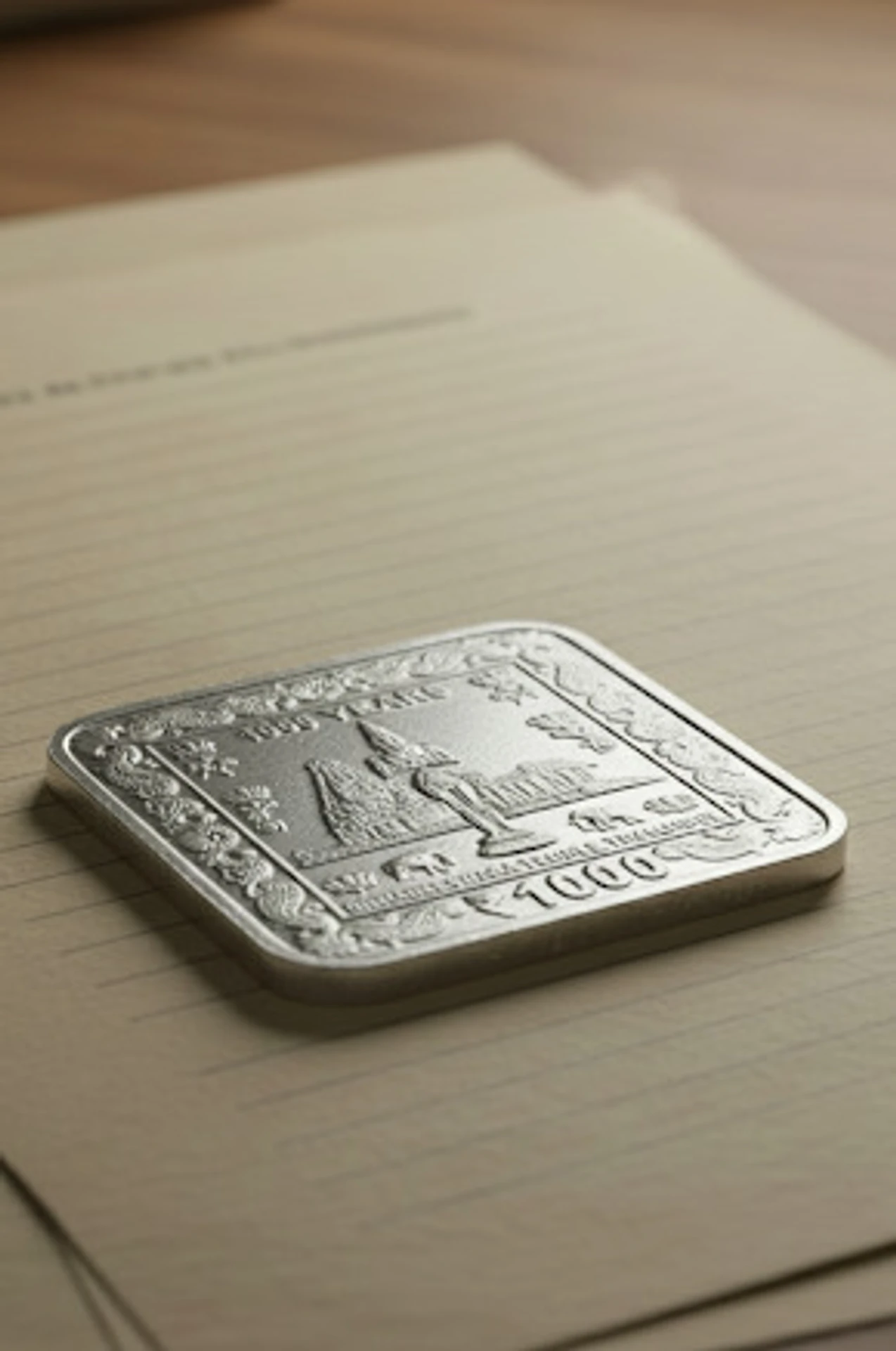 BRIHADEESHWARA TEMPLE THANJAVUR 1000 RUPEE RARE SILVER PLATED 100 GRAM RARE BEAUTIFUL TOKEN COIN WITH BOX STAND