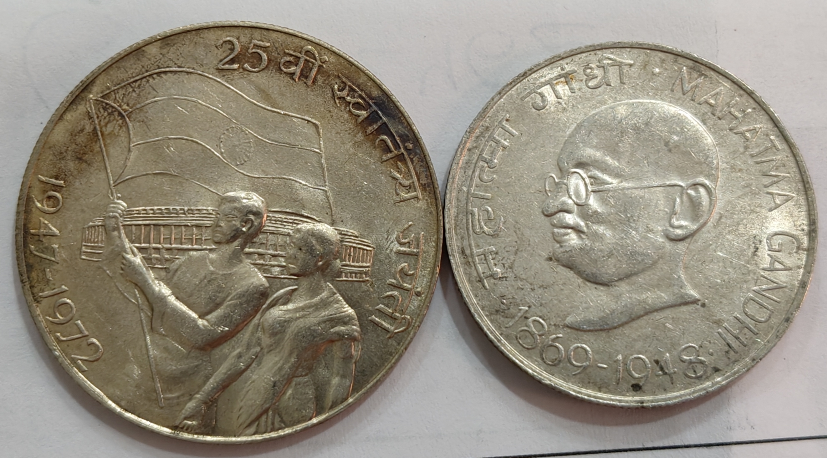 SILVER 10RS 1972 25TH ANNIVERSARY OF INDEPENDENCE WEIGHT 22 GM & M.GANDHI 100TH BIRTHDAY EXCELLENT CONDITION. Same and similar piece available# 40