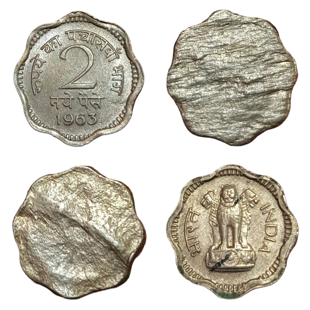 2 NAYE PAISE Cu/Ni Year 1963 OBVERSE and REVERSE Side SPLIT PLANCHET UNIFACE Error SET 2 Coins **V. RARE** High AUNC Grade.