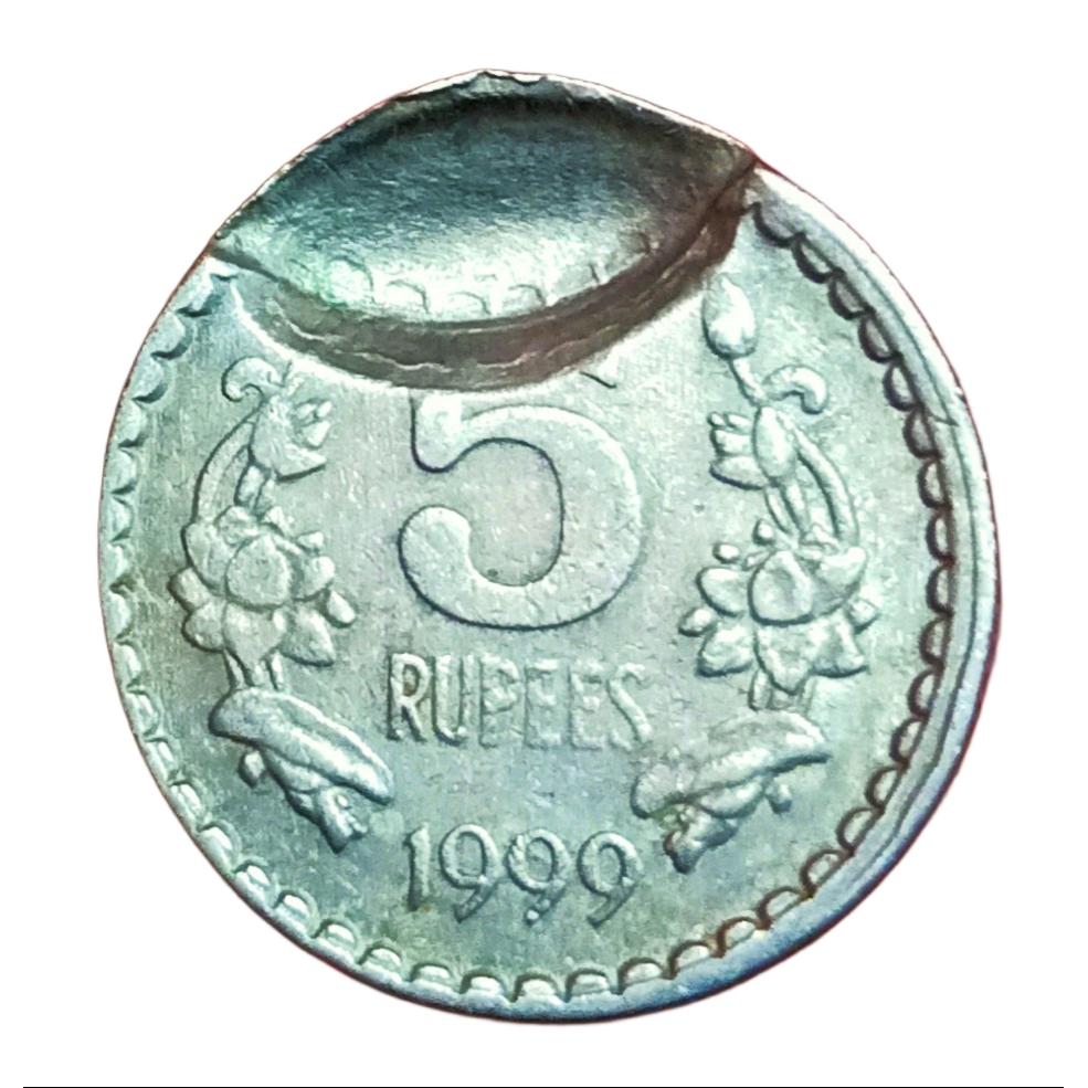 5 Rupees Cu/Ni Year 1999 Partial LAKHI or Partial BROCKAGE Error in High Collectable Grade.