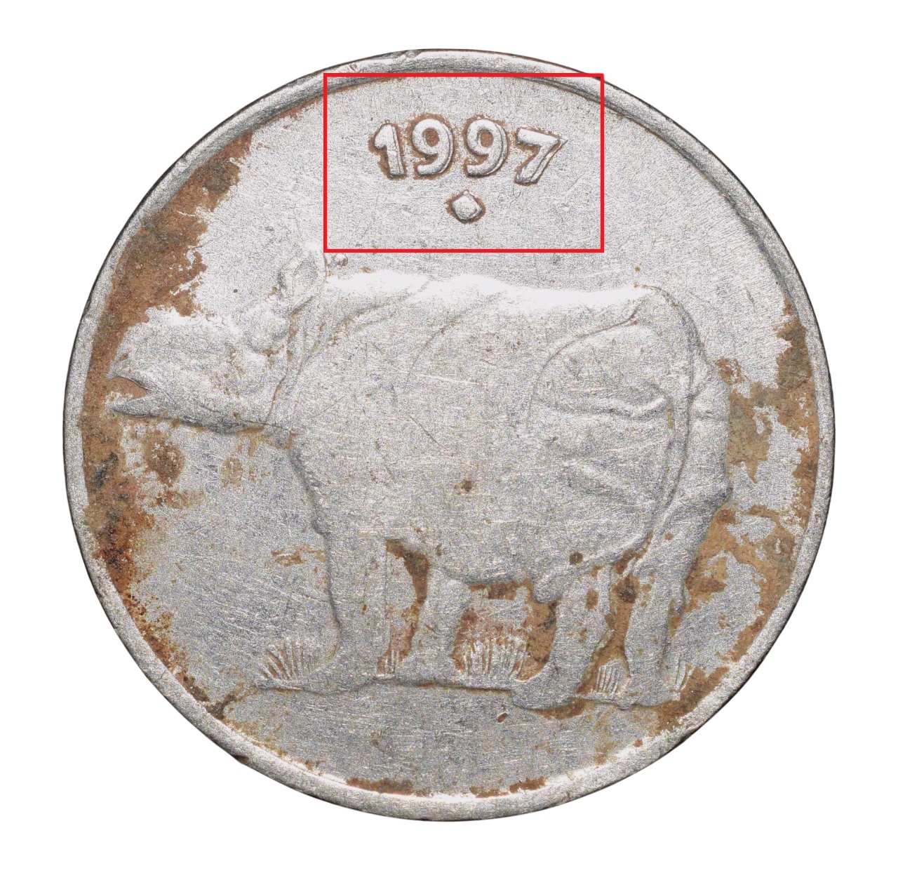 Republic India, (AD 1997), Steel 25 Paise, Rhinosoros Type, Bombay Mint, Die-Shifting/Double-Struck Error, About Fine, Rare Error.