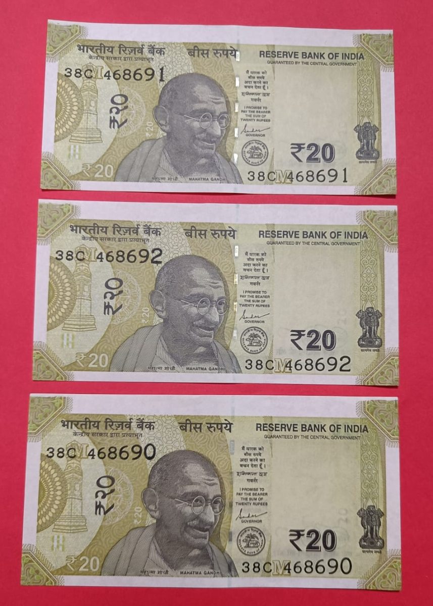 20 Rs Shifting Error with above Extra Margin Condition GEM UNC (Set of 3 Notes)