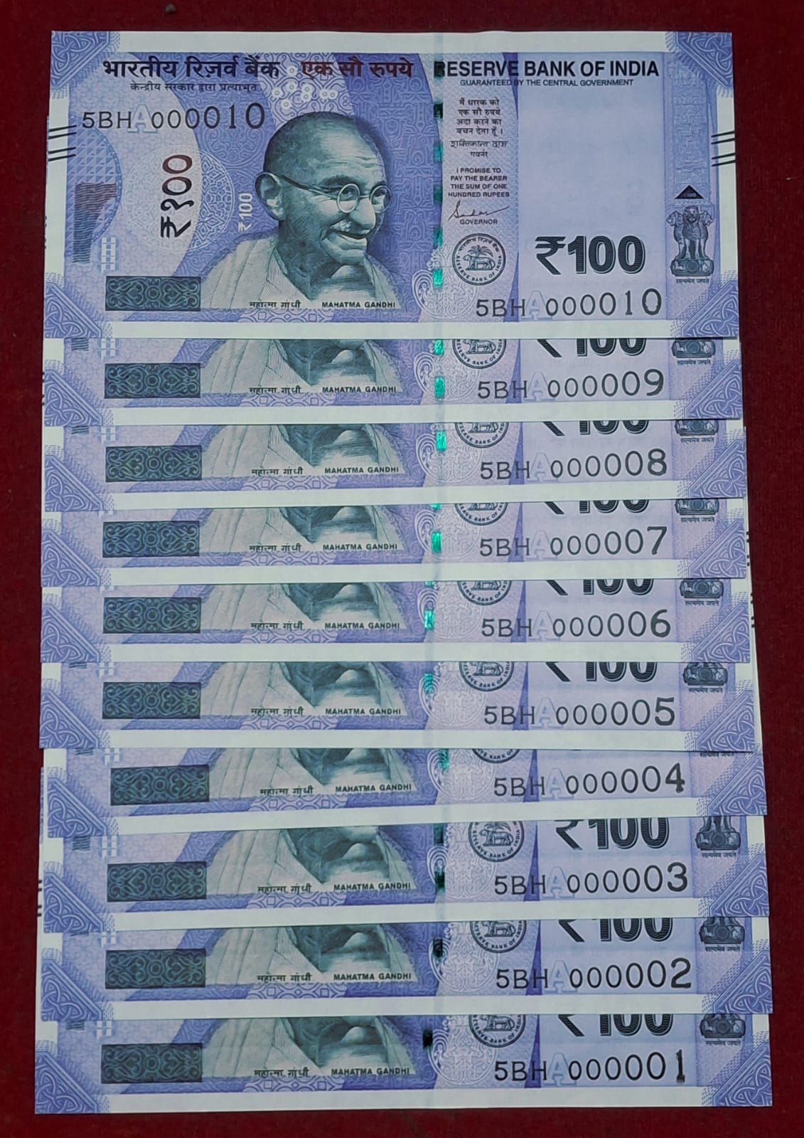 000001 – 000010 ( 10 PCS SET) 100 RUPEES GEM UNC RARE ( 10 NOTE SET) WITH SAME PREFIX