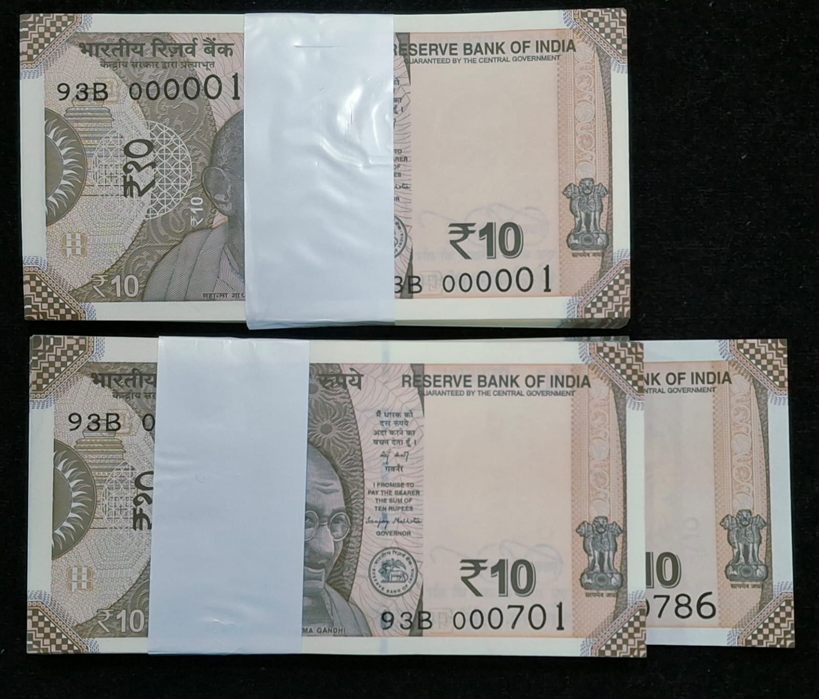 (000001 TO 000100) + (000701 TO 000800) FANCY NUMBER SERIEL PACKET 10 RUPEES 2025 GOVERNOR SANJAY MALHOTRA SAME PREFIX 2 PACKET