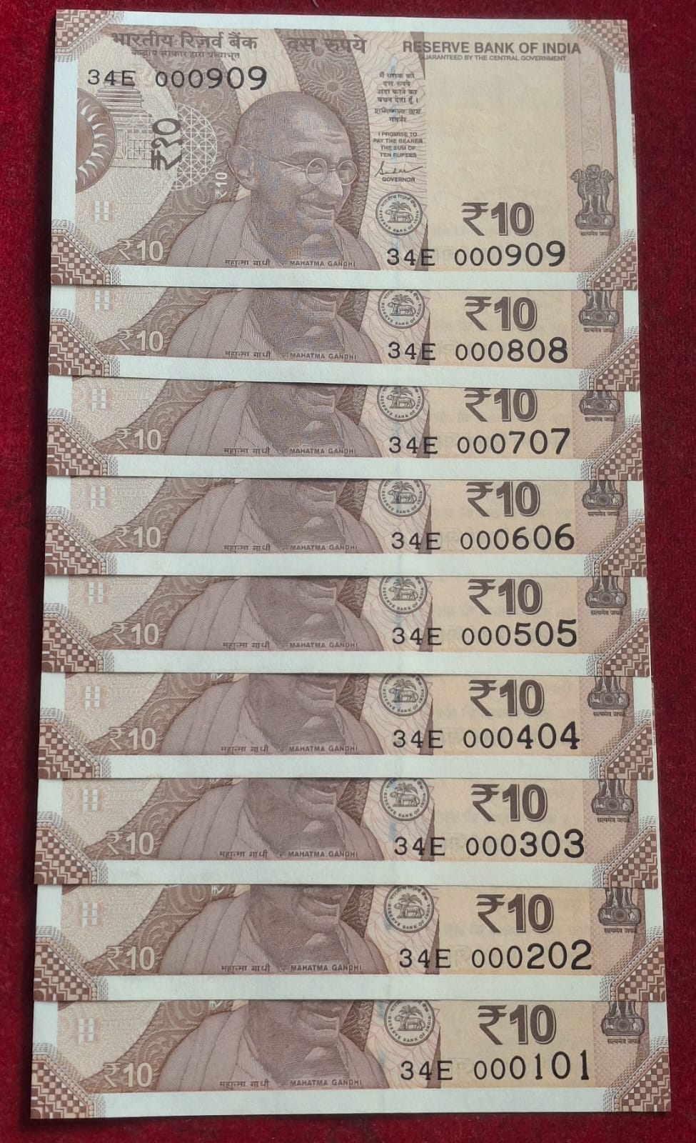 000101 – 000909 ( 9 PCS SET) 10 RUPEES GEM UNC RARE ( 9 NOTE SET)