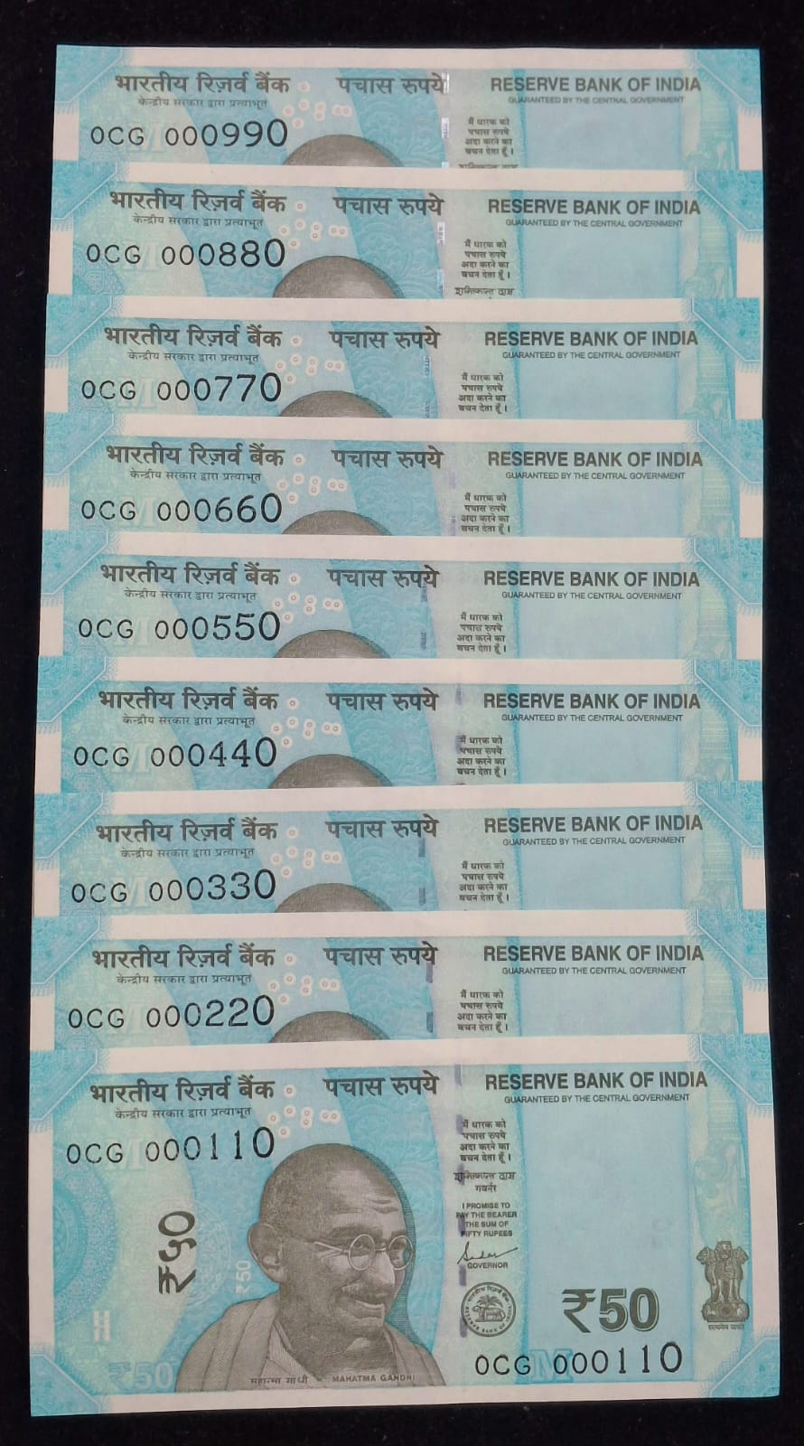 000110 – 000990 FANCY NUMBER RARE 50 RUPEES GEM UNC RARE (9 NOTE SET)