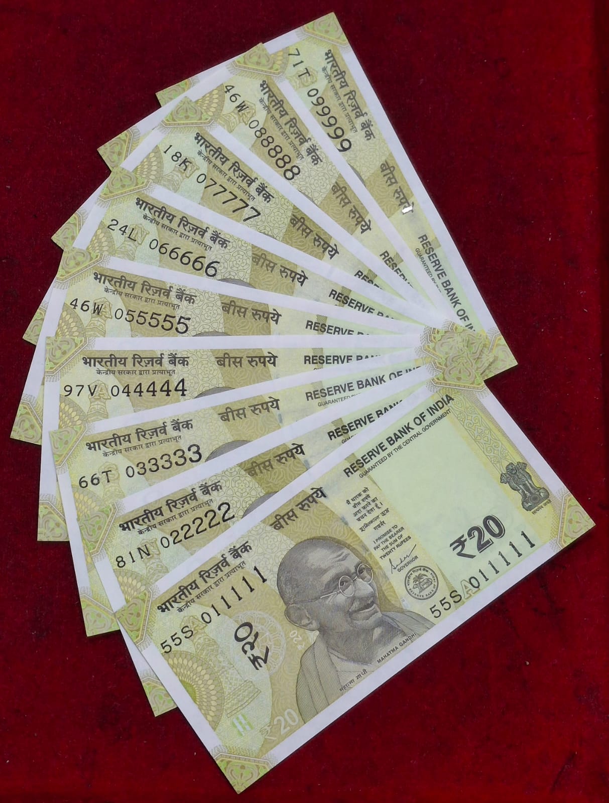 011111 – 099999 ( 9 PCS SET) 20 RUPEES GEM UNC RARE ( 9 NOTE SET)