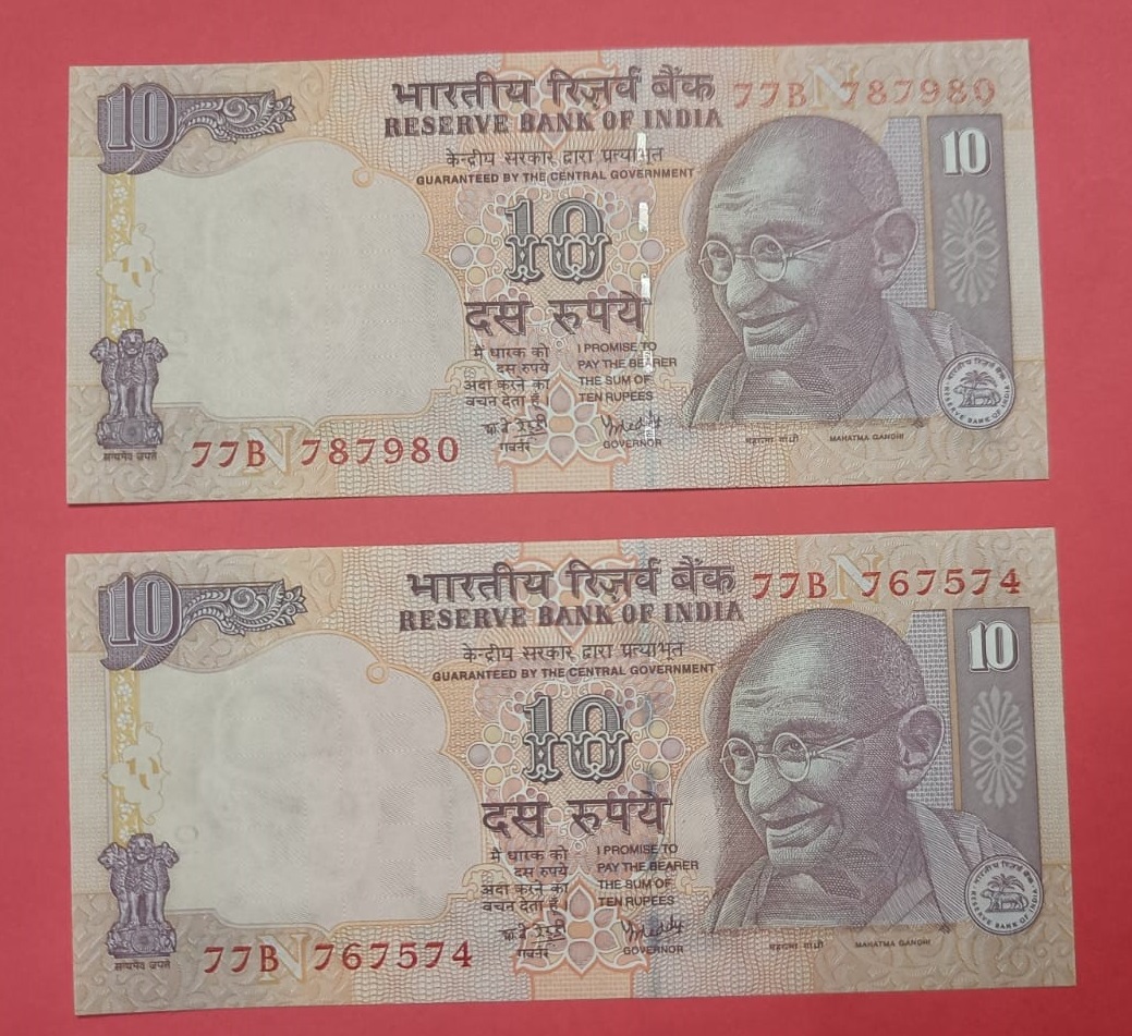 10 Rs Super Ascending and Descending GEM UNC Condition Note Same Prefix 77787980 and 77767574 Y V Reddy