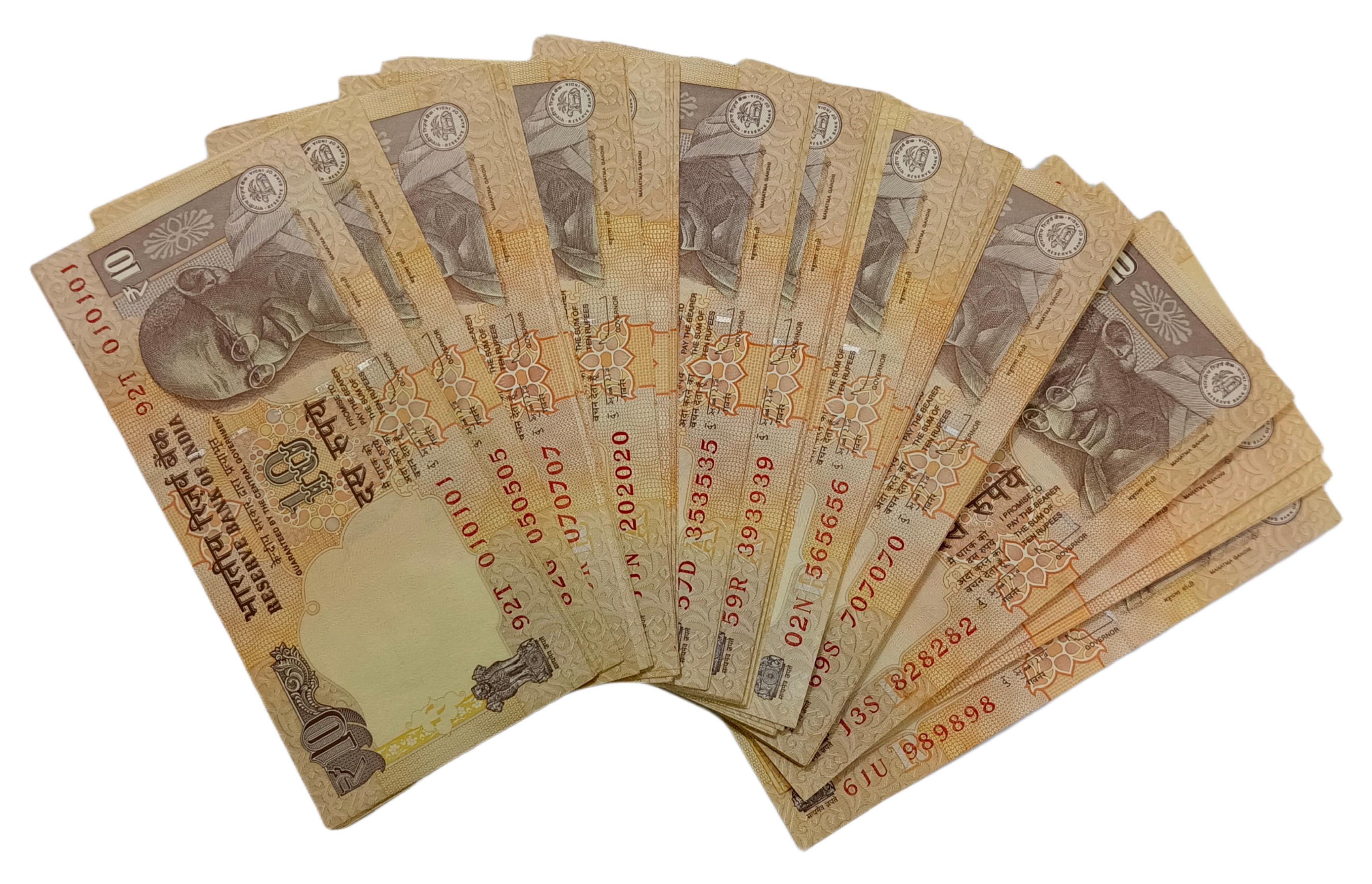 Indulge in the rarity of this exquisite collectible set featuring 10 Rupees GANDHI Issue notes by D. SUBBARAO. This complete set comprises 90 notes, all adorned with fancy triplets serial numbers, making it a true gem for any collector. Issued in UNC (new) condition, these notes boast impeccable quality and remain untouched by time.