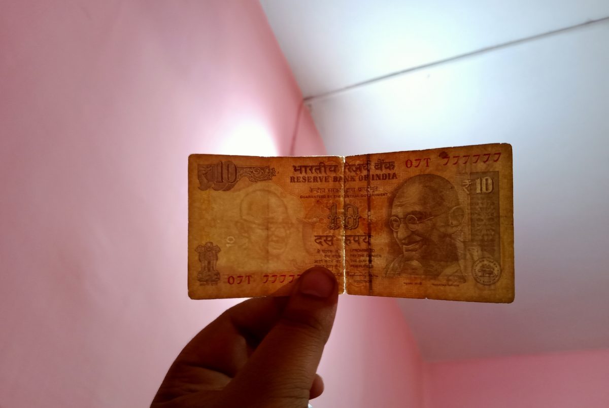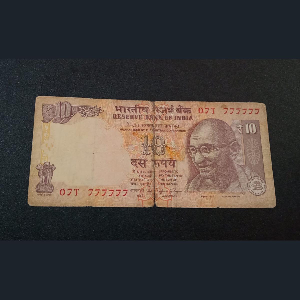 10 Rupees Gandhi Series Signature RAGHU RAM RAJAN Small Digits SEMI SUPER FANCY Number 07-777777 RARE Used Repaired Condition.