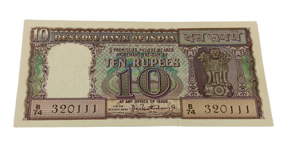10 Rupees Old ORNAMENTAL Diamond P.C BHATTACHARYA with FANCY “Reverse 123” Serial Number **RARE** High AUNC Grade.