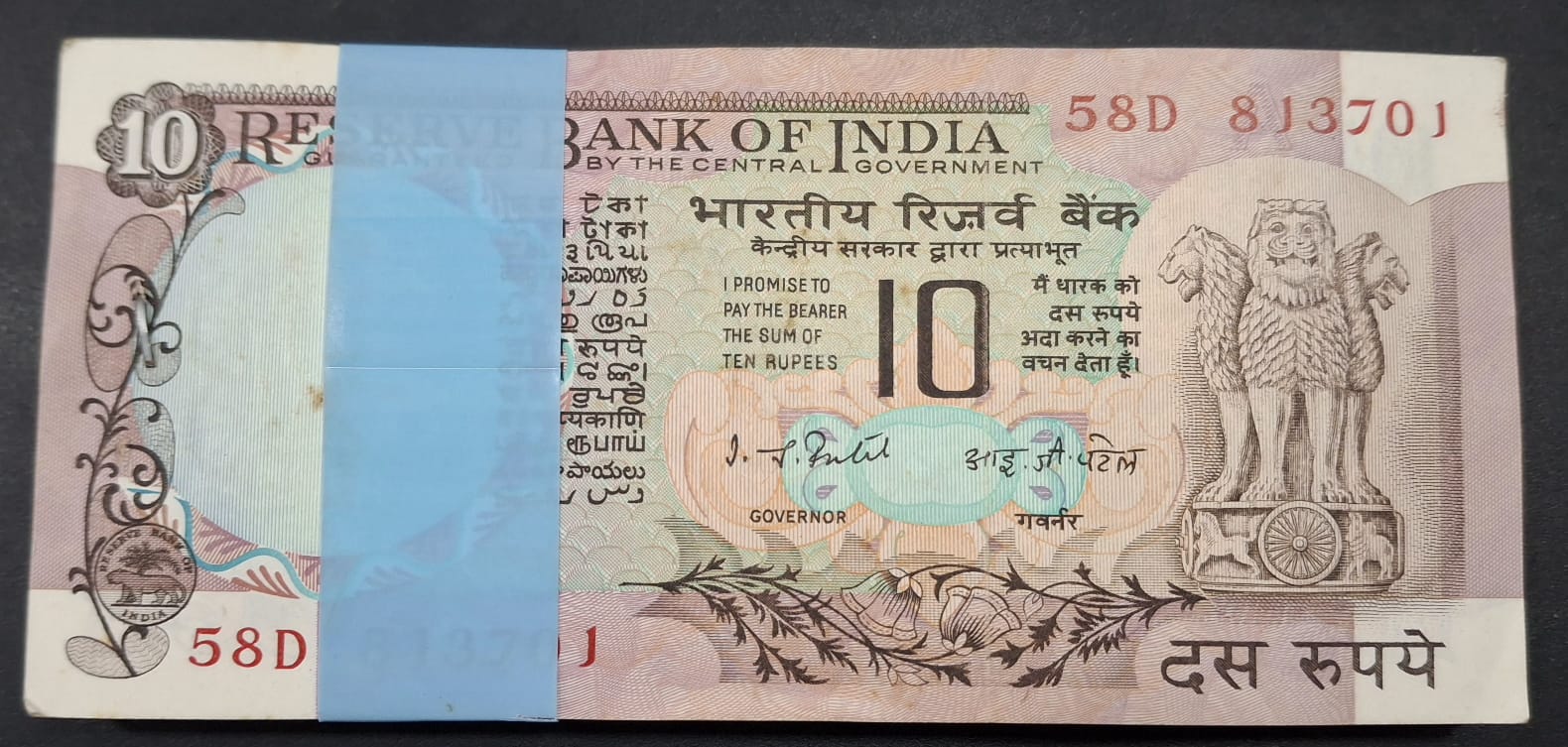 10 RUPEES PEACOCK GOVERNOR I.J.PATEL RARE 100 NOTES CHOCOLATE CONDITION SERIAL PACKET WITH FANCY NUMBER ENDING 786