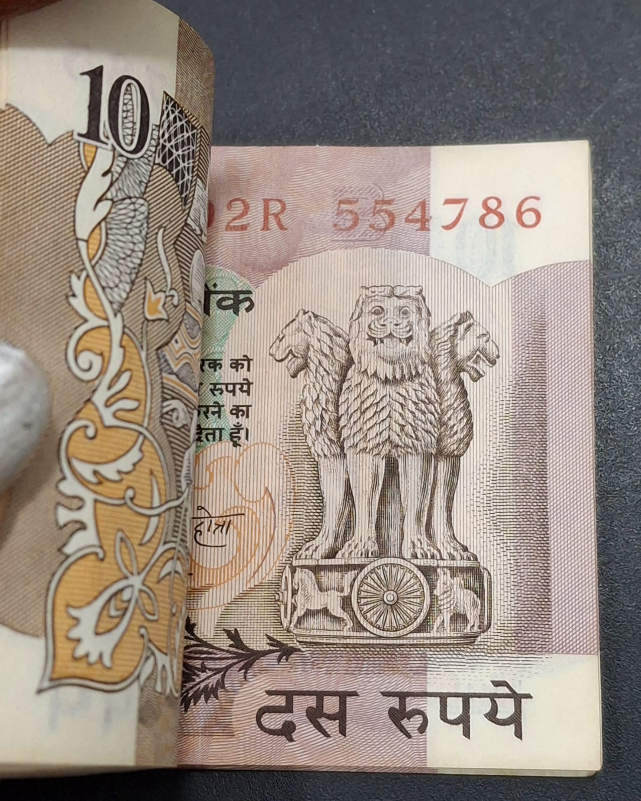 This particular packet is distinguished by its fancy number ending in 786, a significant number in certain cultures and highly valued by collectors for its auspicious connotations. Governor R.N. Malhotra’s signature adds historical importance to these notes, making them a rare find for collectors looking to expand their collection with unique pieces.