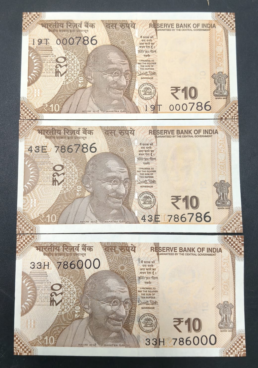 10 RUPEES RARE ( 3 NOTE SET) 786786+786000+000786 GEM UNC