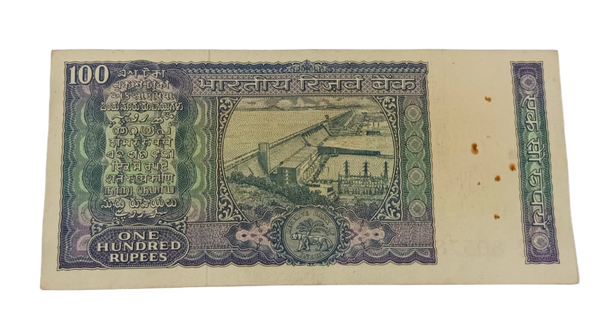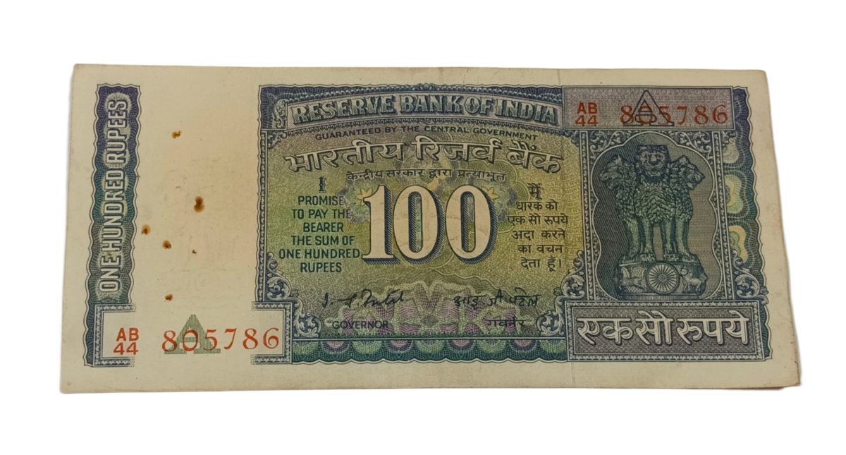 100 Rupees Old Issue SMALL DAM Issue I.G PATEL with SEMI-FANCY Ending 786 Serial Number **RARE** High Collectable Grade.