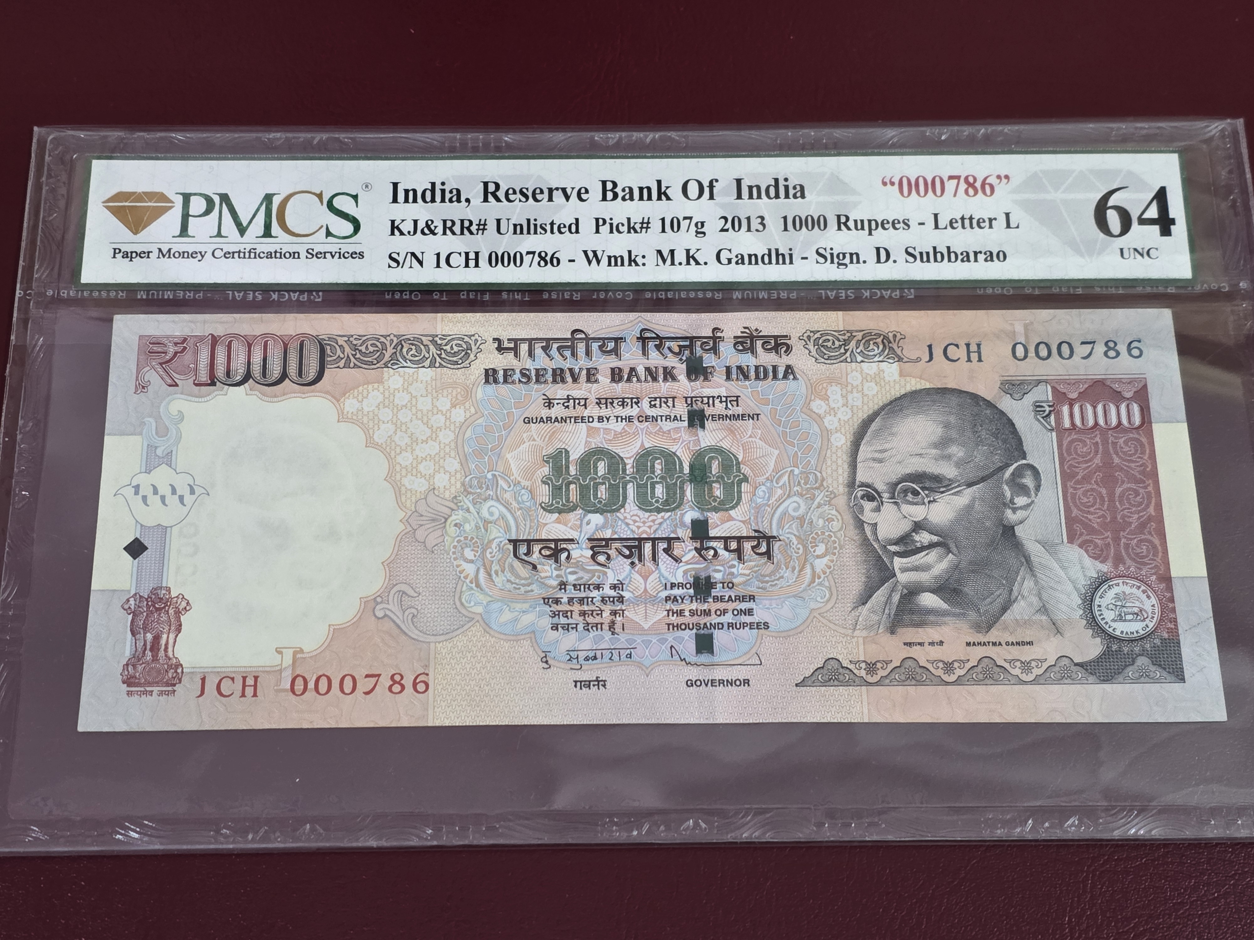 1000rs fancy number 1CH 000-786 signed by D Subbarao with year 2013