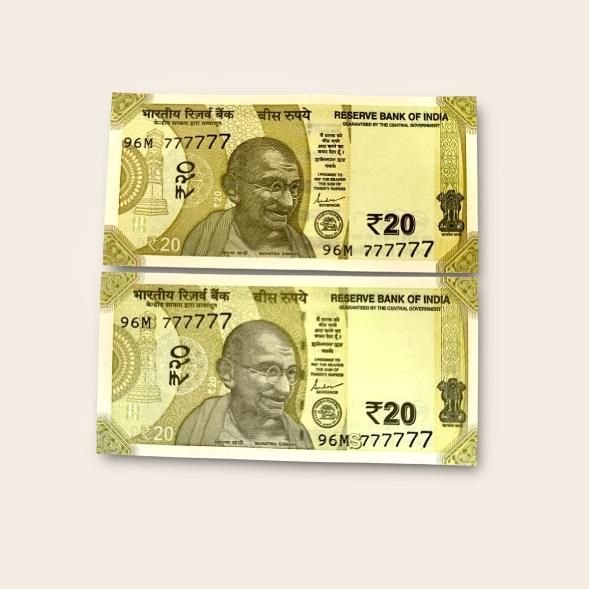 Rs 20 TWIN SET Gem Unc Very Unique Bank Note Set Number 96M 777777