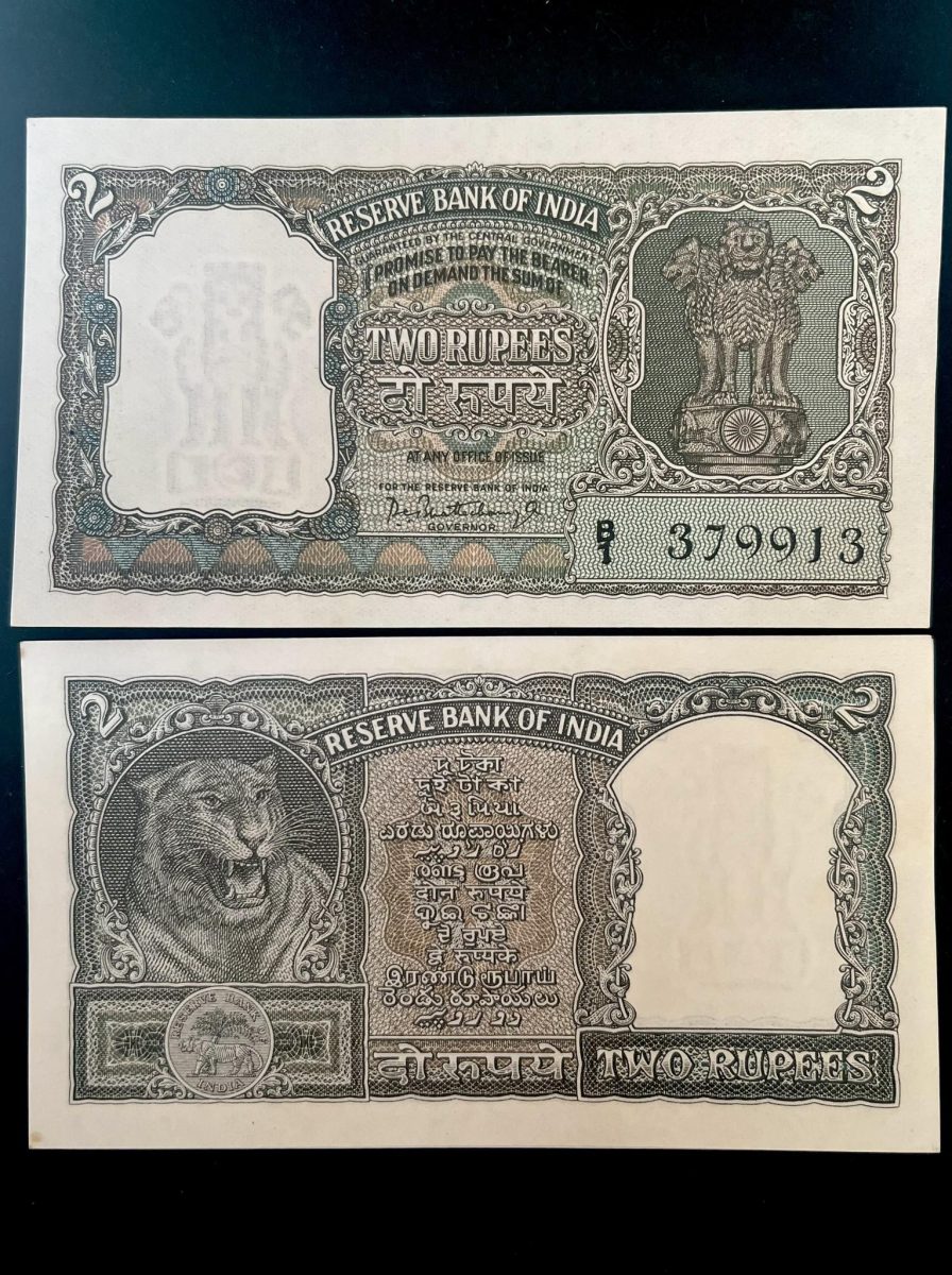 B-6 Rs 2 India Banknote Signature series Signed by P.C.BHATTACHARYA Inset PLAIN 1967 issue