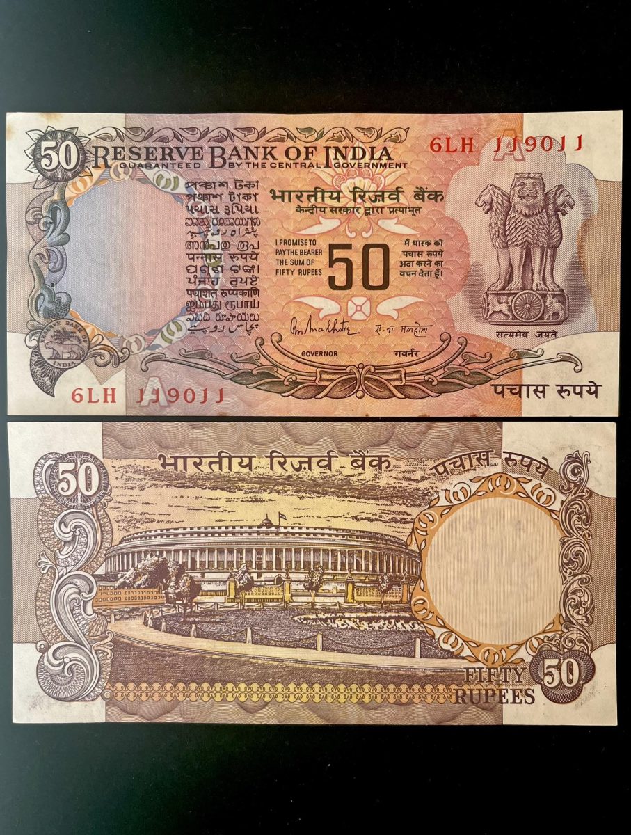 F-8 Rs 50 India Banknote Signature series Signed by R.N.MALHOTRA Inset A 1985 – 90 issue