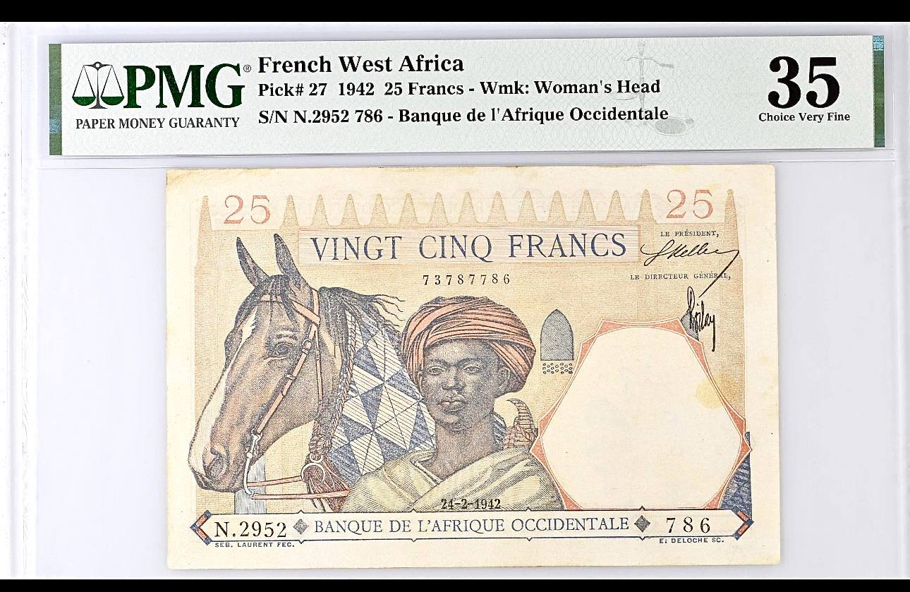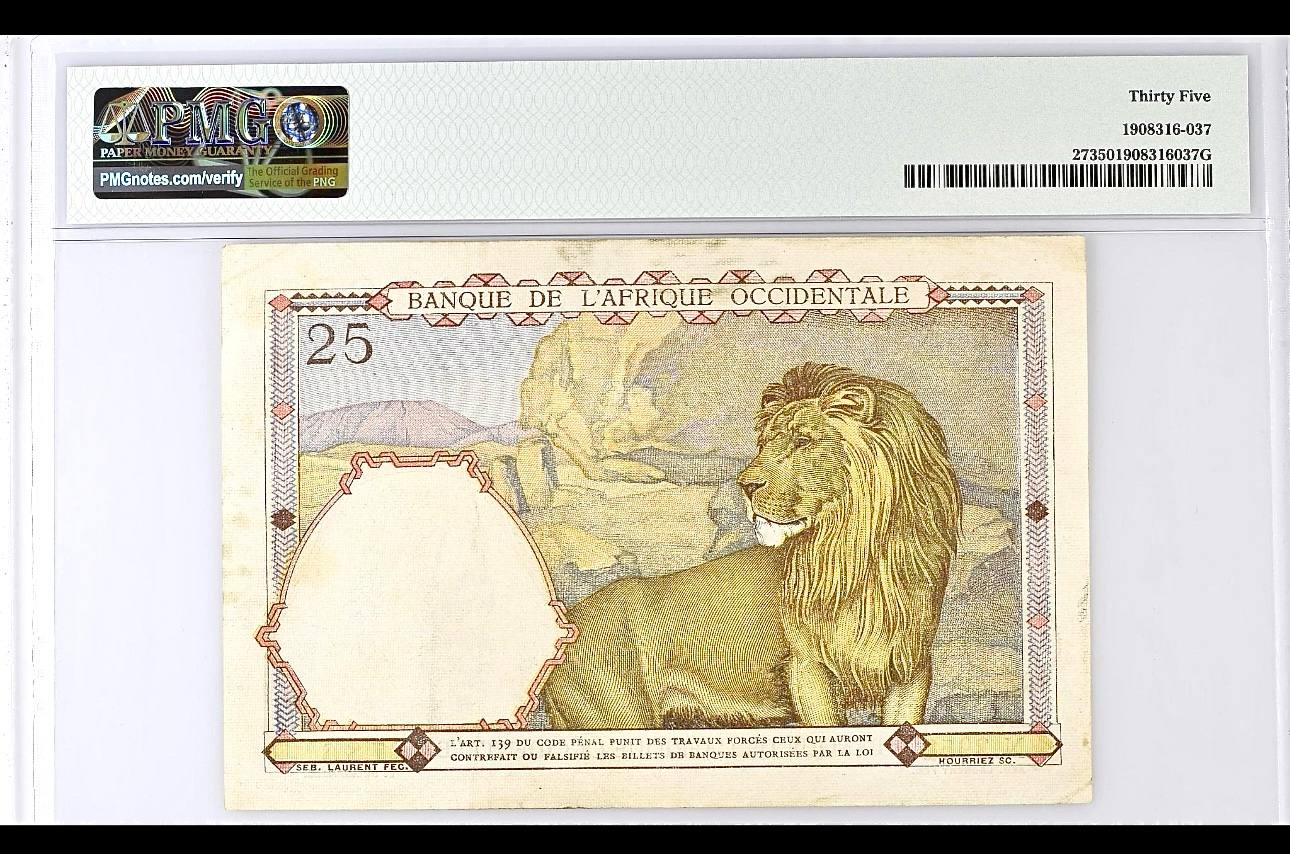 - French West Africa 25 Francs 1942 Wmk Womans Head PMG Graded 35 Ending 786 Very Unique and Rare Lion