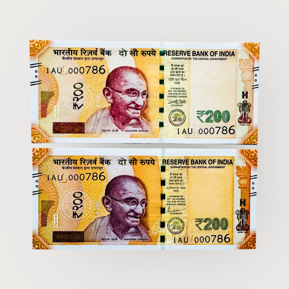 India Banknote Rs 200 Twin Set Gem Unc Bank Note Set Solid Holy Number 1AU 000786