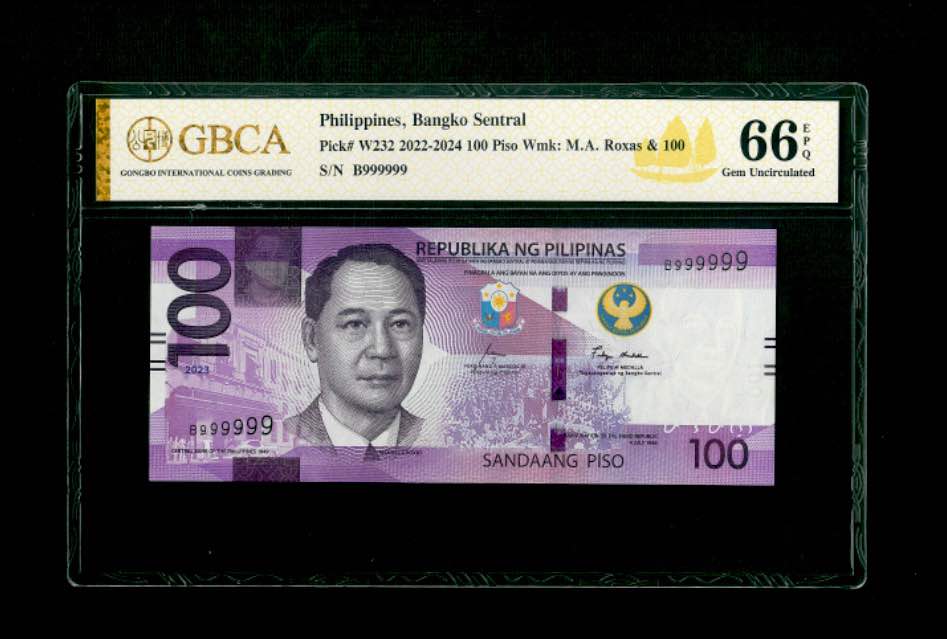 Philippines Bangko Sentral Super Fancy Serial Number B999999 Gem UNC Graded EPQ 66 Unique and Rare 2023 Issue