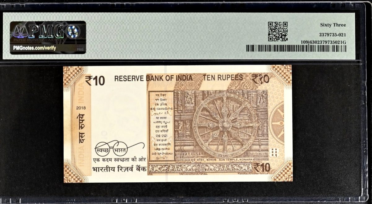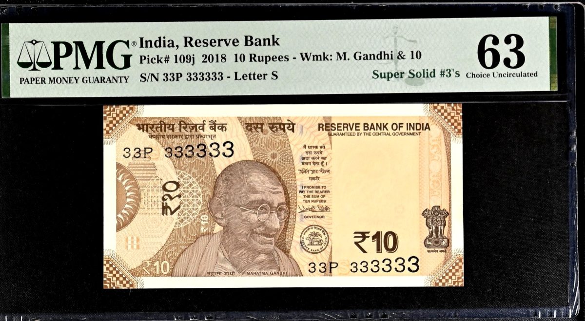 This Rs 10 India Banknote, issued in 2018 and graded by PMG as 63, is a true gem for collectors. Featuring a watermark of M. Gandhi & 10, this note is signed by Urjit Patel with the serial number 33S 333333, making it exceptionally rare. The fancy number 333333 adds to its uniqueness, appealing to both numismatists and history enthusiasts. This collectible piece not only represents a piece of India’s economic history but also showcases the artistry in banknote design. Its pedigree as a Super Solid #3’s note further enhances its value and desirability among collectors. With its impeccable grade and distinctive features, this banknote is a prized addition to any collection.