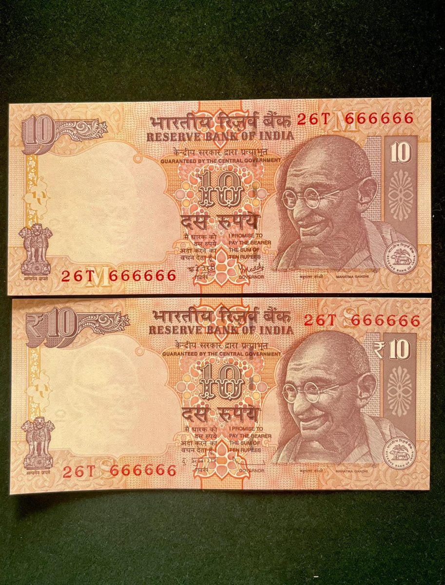 Rs 10 India Banknote Twin Set Gem Unc Very Unique Set Solid Number 26T 666666