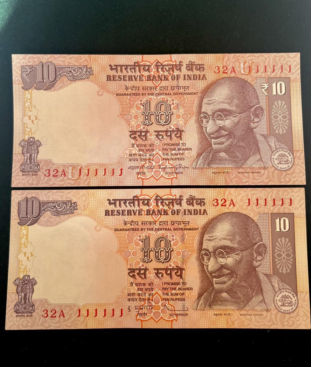 Rs 10 India Banknote TWIN SET Gem Unc Very Unique Set Solid Number 32A 111111