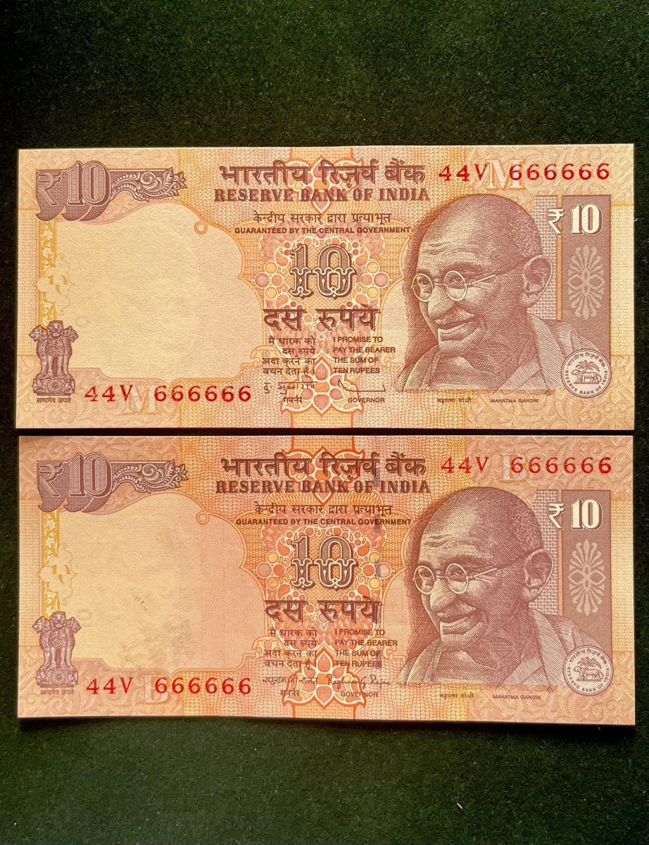Rs 10 India Banknote TWIN SET Gem Unc Very Unique Set Solid Number 44V 666666